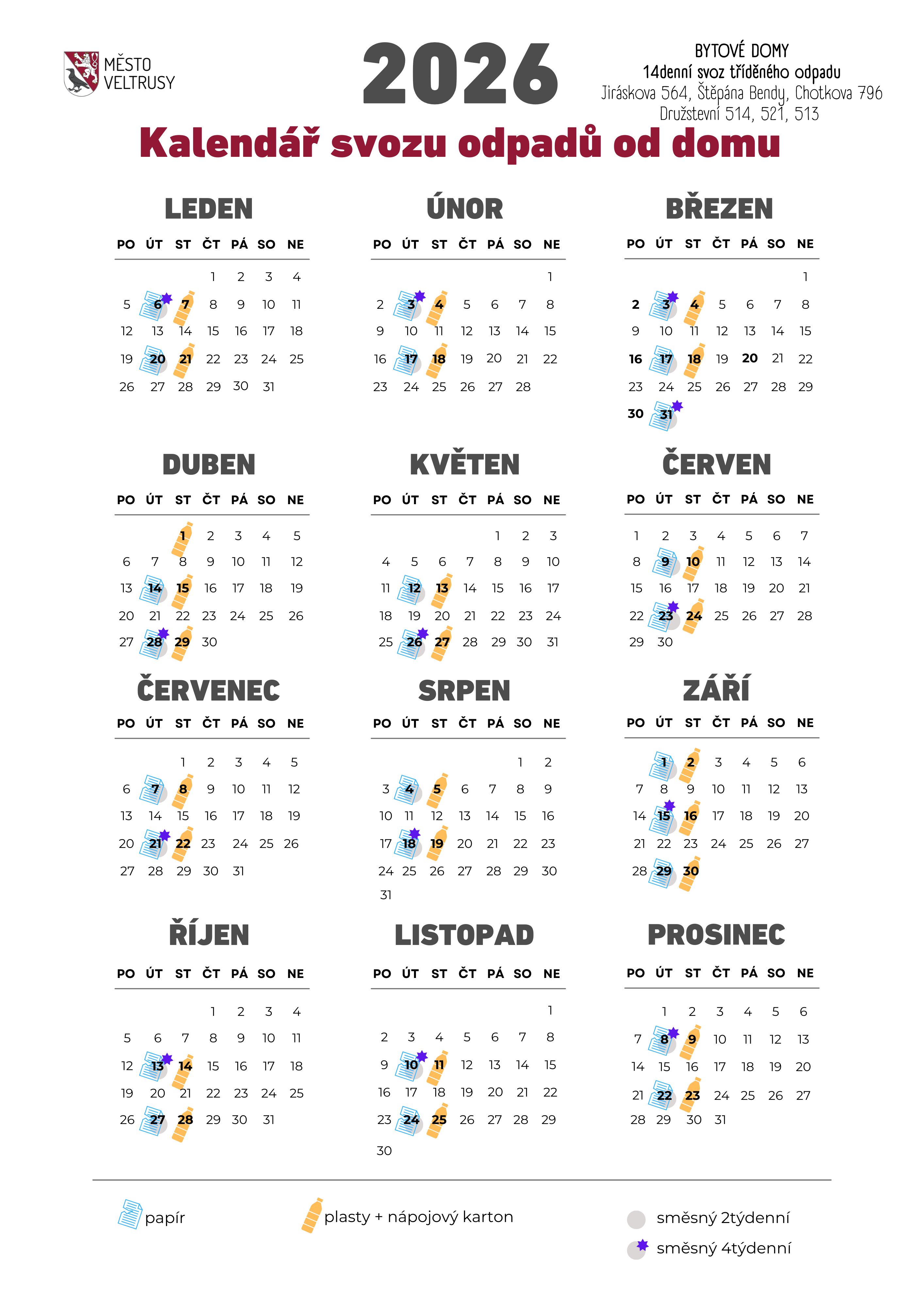 • PAPÍR: Jiráskova 564, Družstevní 514, 521, 513, Štěpána Bendy (vždy ÚTERÝ V SUDÉM TÝDNU)