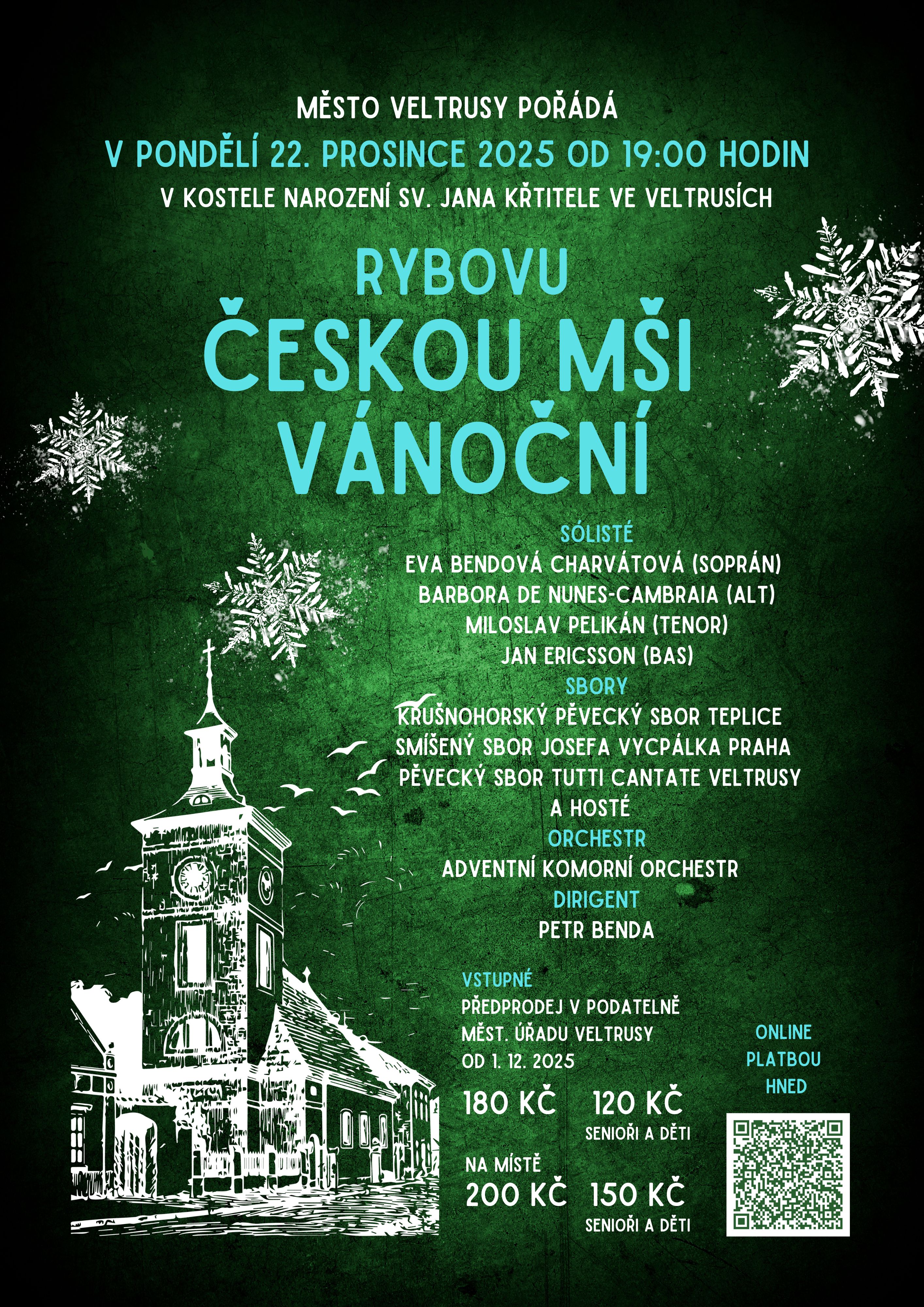 Zveme vás v pondělí 22. prosince 2025 od 19 hodin na Rybovu Českou mši vánoční do kostela Narození sv. Jana Křtitele ve Veltrusích. Vstupenky jsou v předprodeji on-line nebo na podatelně.