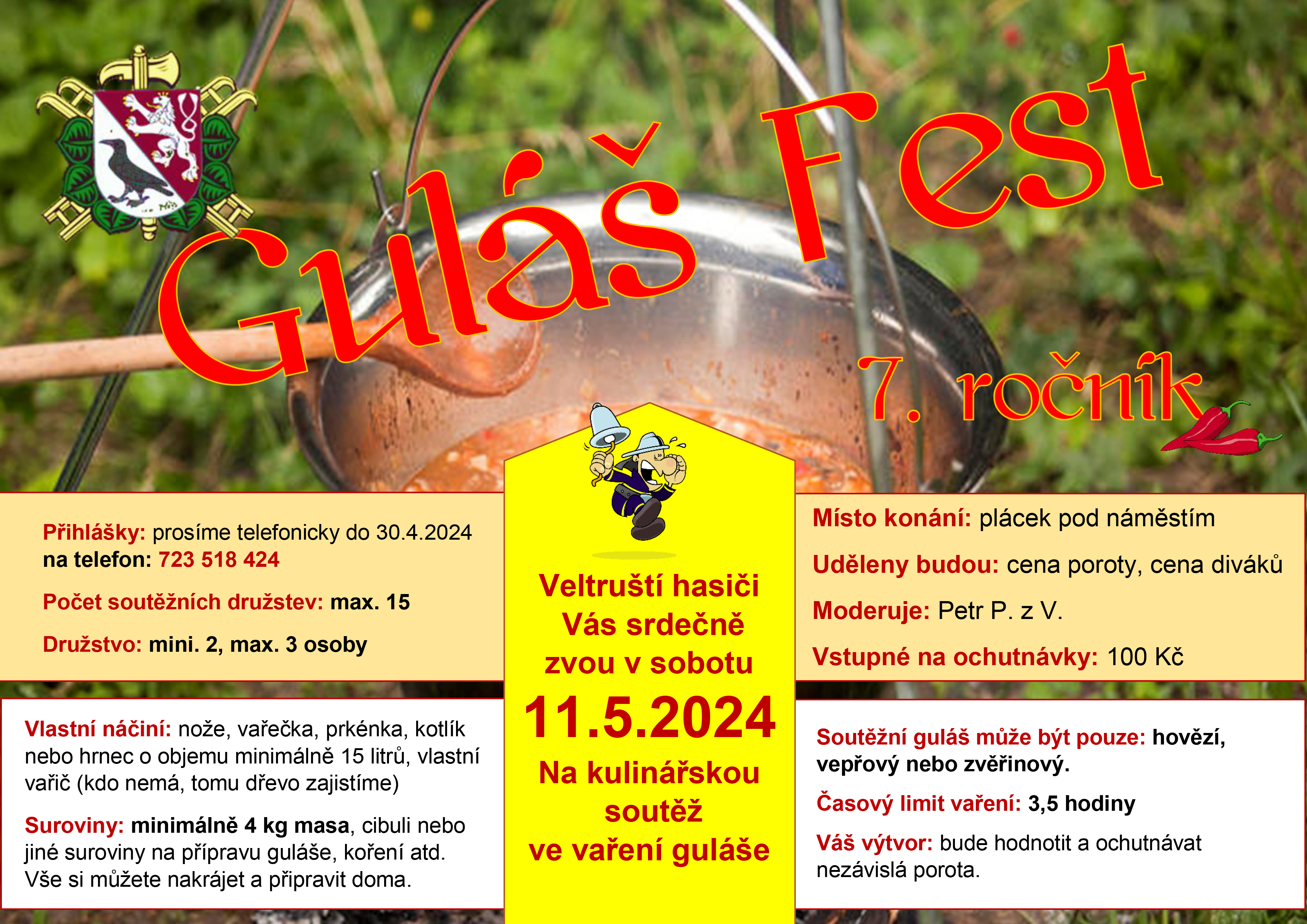 Sbor dobrovolných hasičů zve v sobotu 11. května 2024 na Guláš fest, který se letos uskuteční pod náměstím A. Dvořáka. Přihlášky se přijímají do 30. dubna, počet soutěžních družstev je max. 15. Vstupné na ochutnávku: 100 Kč.