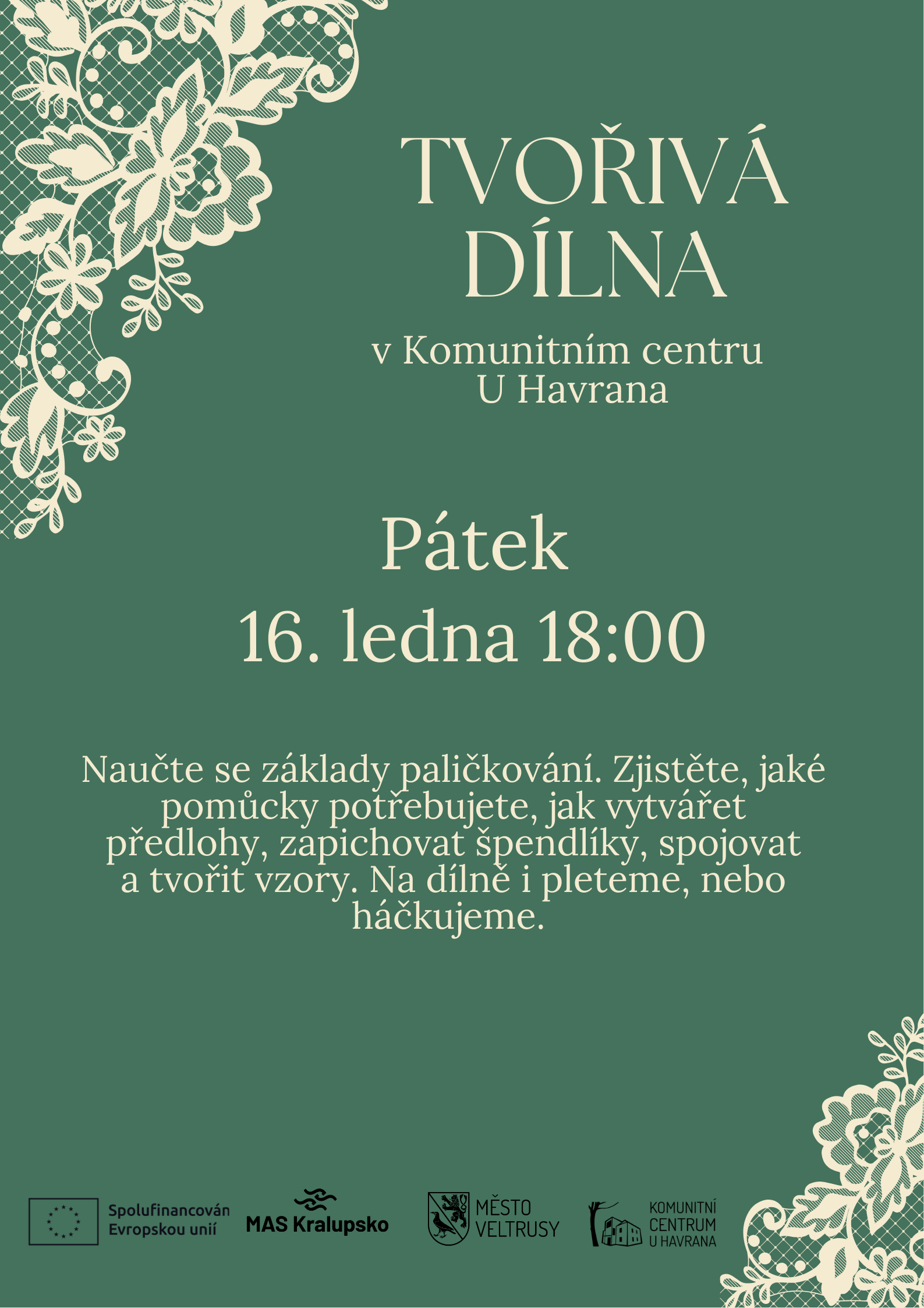 Přijďte s námi sdílet zkušenosti v oblasti pletení a háčkování nebo se naučit základy paličkování. Zjistíte, jaké pomůcky budete potřebovat, jak se vytvářejí předlohy, zapichují špendlíky a tvoří vzory. Dílna je otevřená všem, kteří chtějí tvořit, učit se nové věci nebo jen strávit příjemný čas mezi lidmi se stejným zájmem.