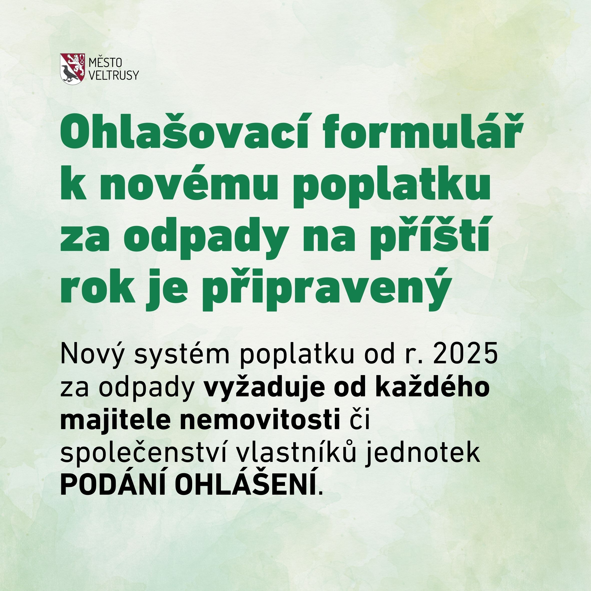 Asi vás neminula informace, že Veltrusy on nového roku mění systém poplatku za odpady. Nový poplatek vyžaduje podání ohlášení. Formulář lze vyplnit online nebo v papírové formě, kterou dostanete během příštího týdne do schránky.