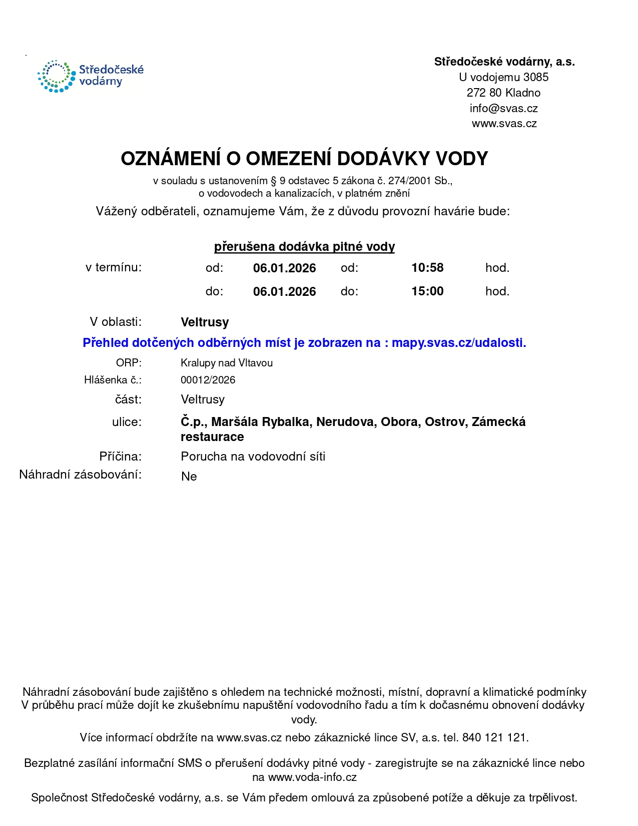 Z důvodu provozní havárie oznamují Středočeské vodárny, a. s., dočasné omezení dodávky pitné vody dne 6. ledna 2026 v době od 10:58 do 15:00 hodin. Přehled dotčených odběrných míst naleznete zde: mapy.svas.cz/udalosti.