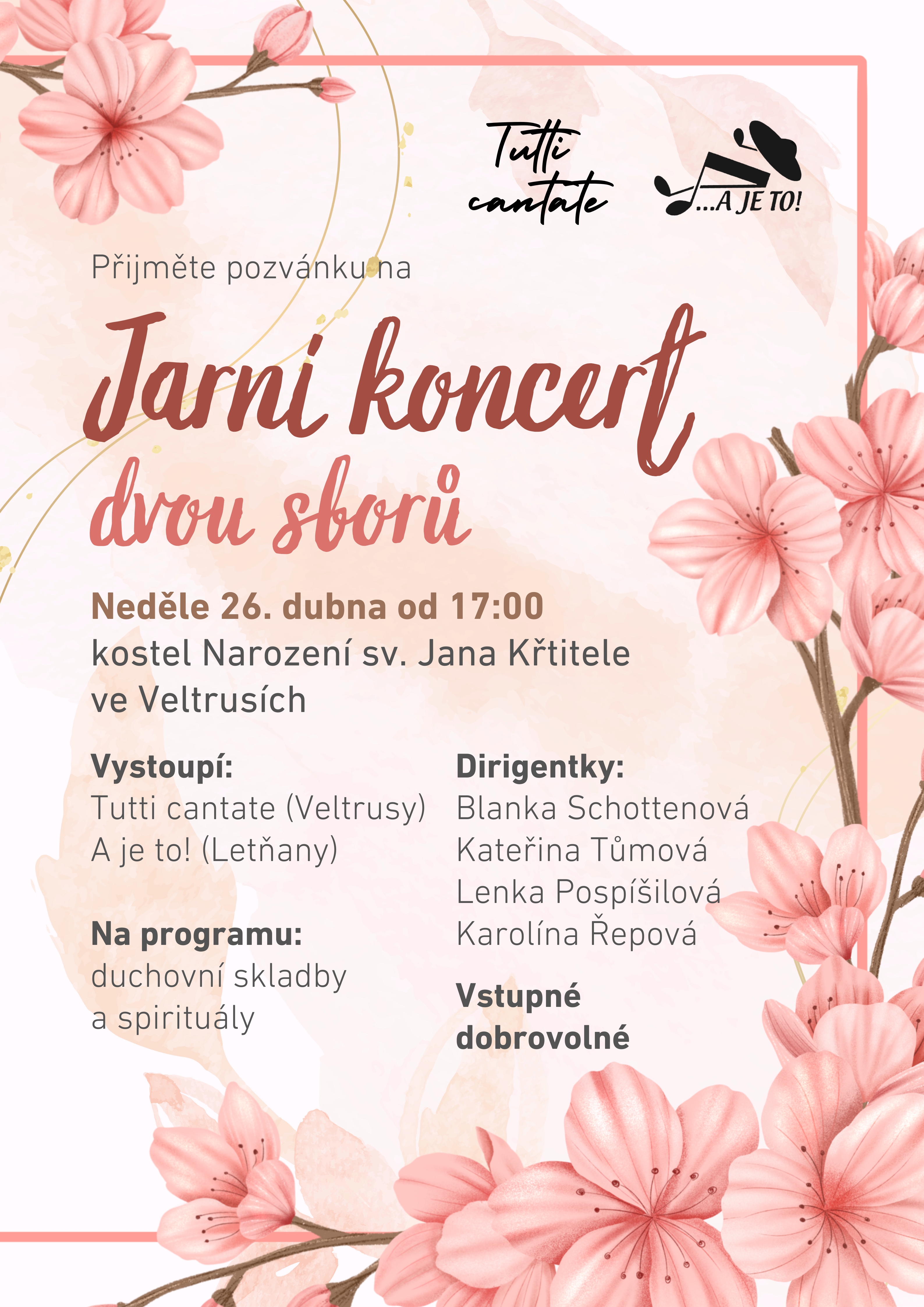 V neděli 26. dubna 2026 od 17:00 přijměte pozvání na jarní koncert dvou sborů: Tutti cantate z Veltrus a A je to! z Letňan. Koncert se uskuteční v kostele Narození sv. Jana Křtitele ve Veltrusích a na programu bude převážně duchovní hudba a spirituály. Vstupné dobrovolné.