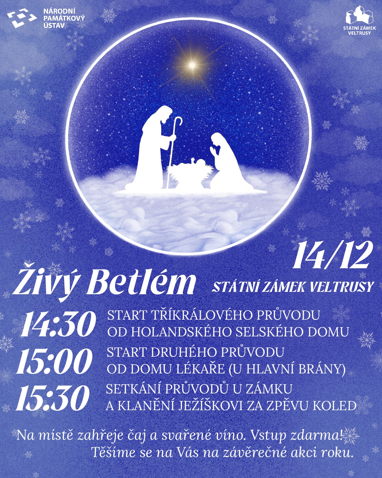 Tradiční závěrečná akce roku – Živý betlém na zámku. Průvod pastýřů a Tří králů vychází z Veltrus a doprovází zpěv koled až k jesličkám u zámku.