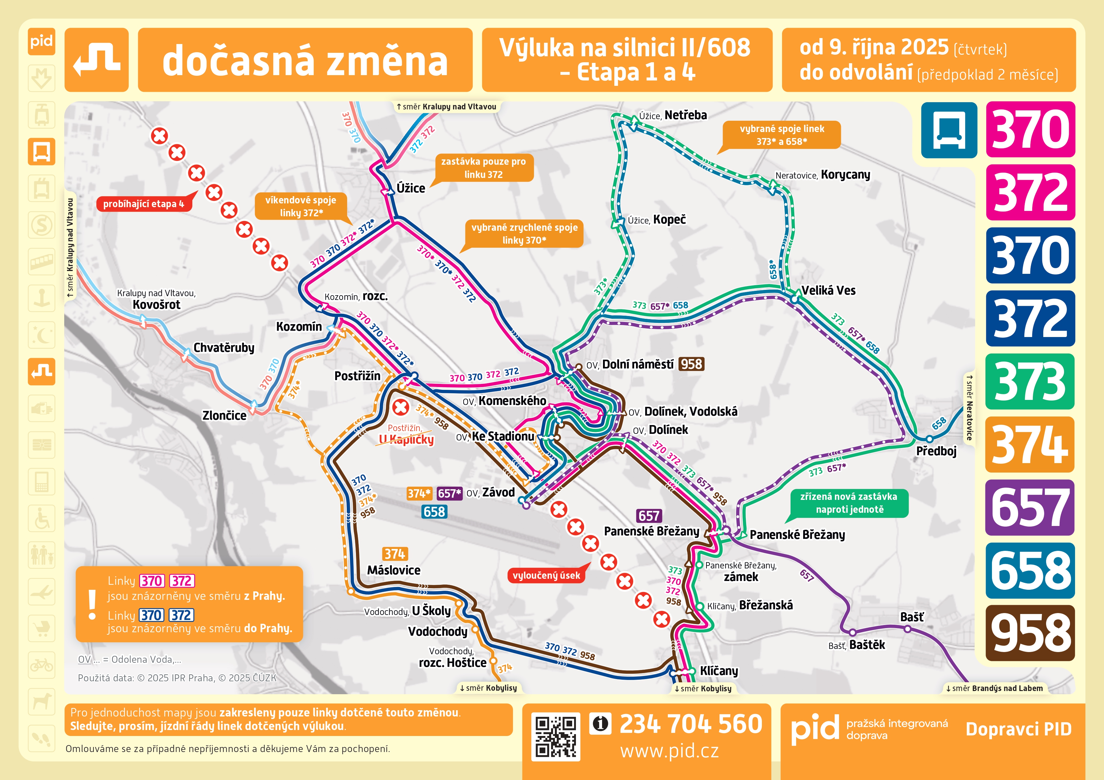 • Provoz linky 370 je nadále ovlivněn probíhající etapou 4 mezi Kozomínem a Veltrusy.