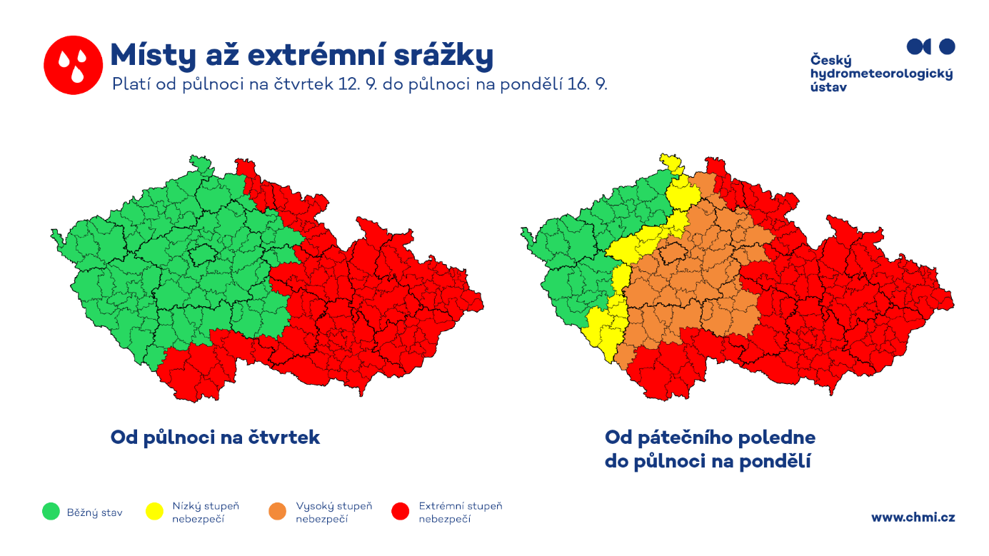 Během období od čtvrtka 12. 9. do neděle 15. 9. se očekává časově a prostorově velice proměnlivá intenzita srážek, od slabých až po extrémní překračující i několik desítek mm za pár hodin.
